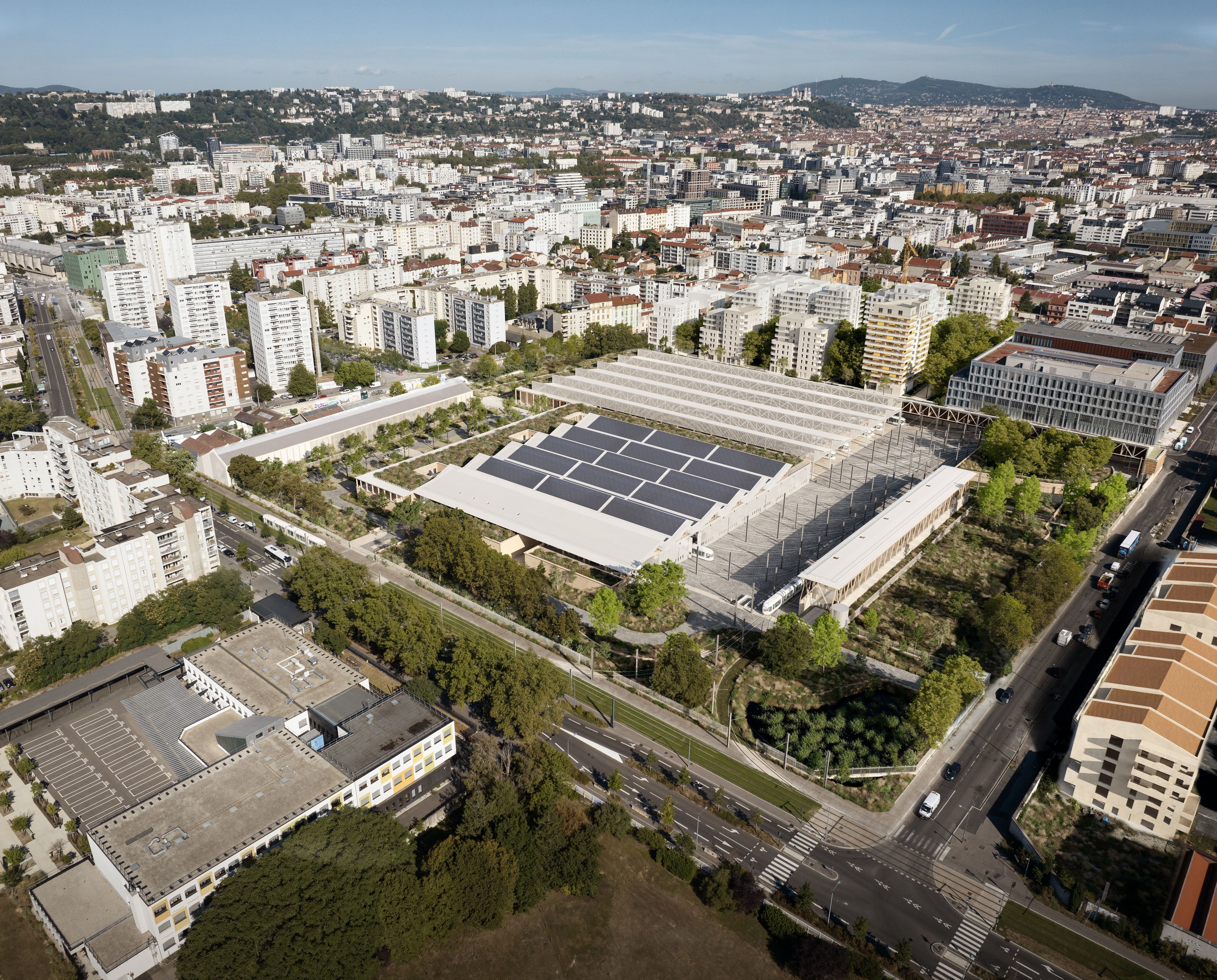 - ParticularitésRéseau de chaleur urbain, photovoltaïque, récupération des eaux pluviales, structure bois, pisé préfabriqué, béton bas carbone