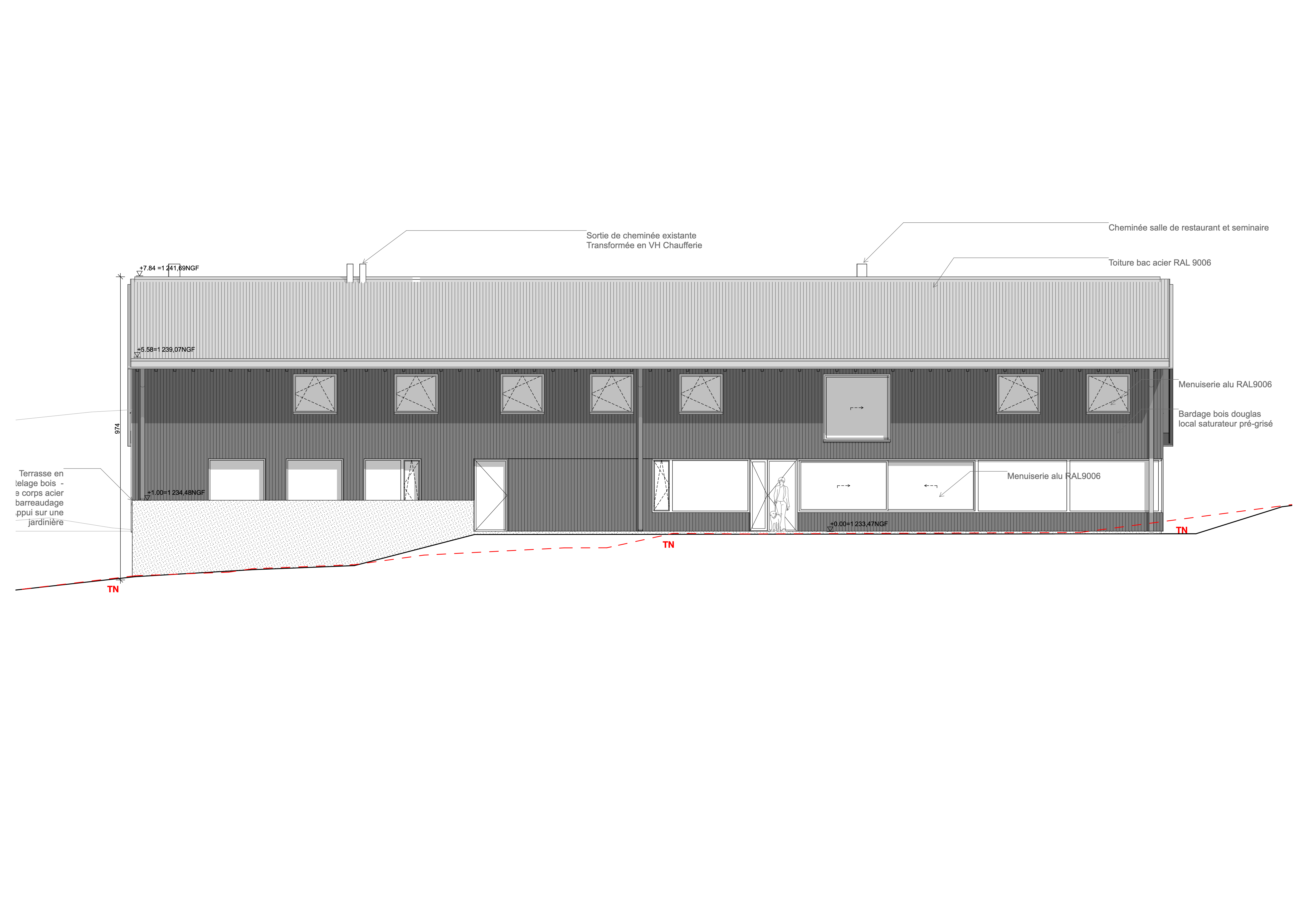 - ParticularitésFondations et dalle béton, superstructure bois, bardage Trespa